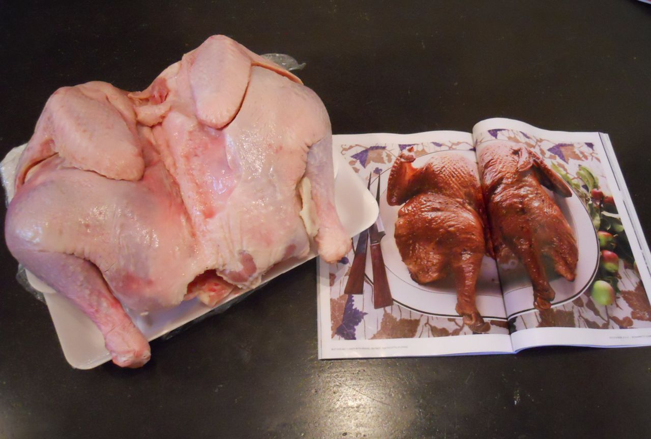 Our local supermarket butterflied a fresh turkey for us and it was easy to prepare and grill. We did the recipe twice and nearly a third time until I relented and gave up on doing a spatchcock comparison. The game was on when Bon Appetit Magazine arrives with a centerfold shot of what else? Butterflied turkey!