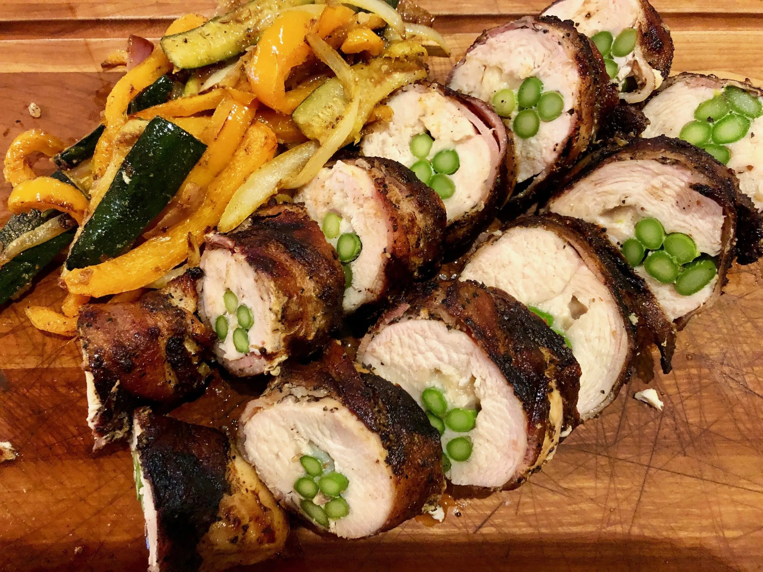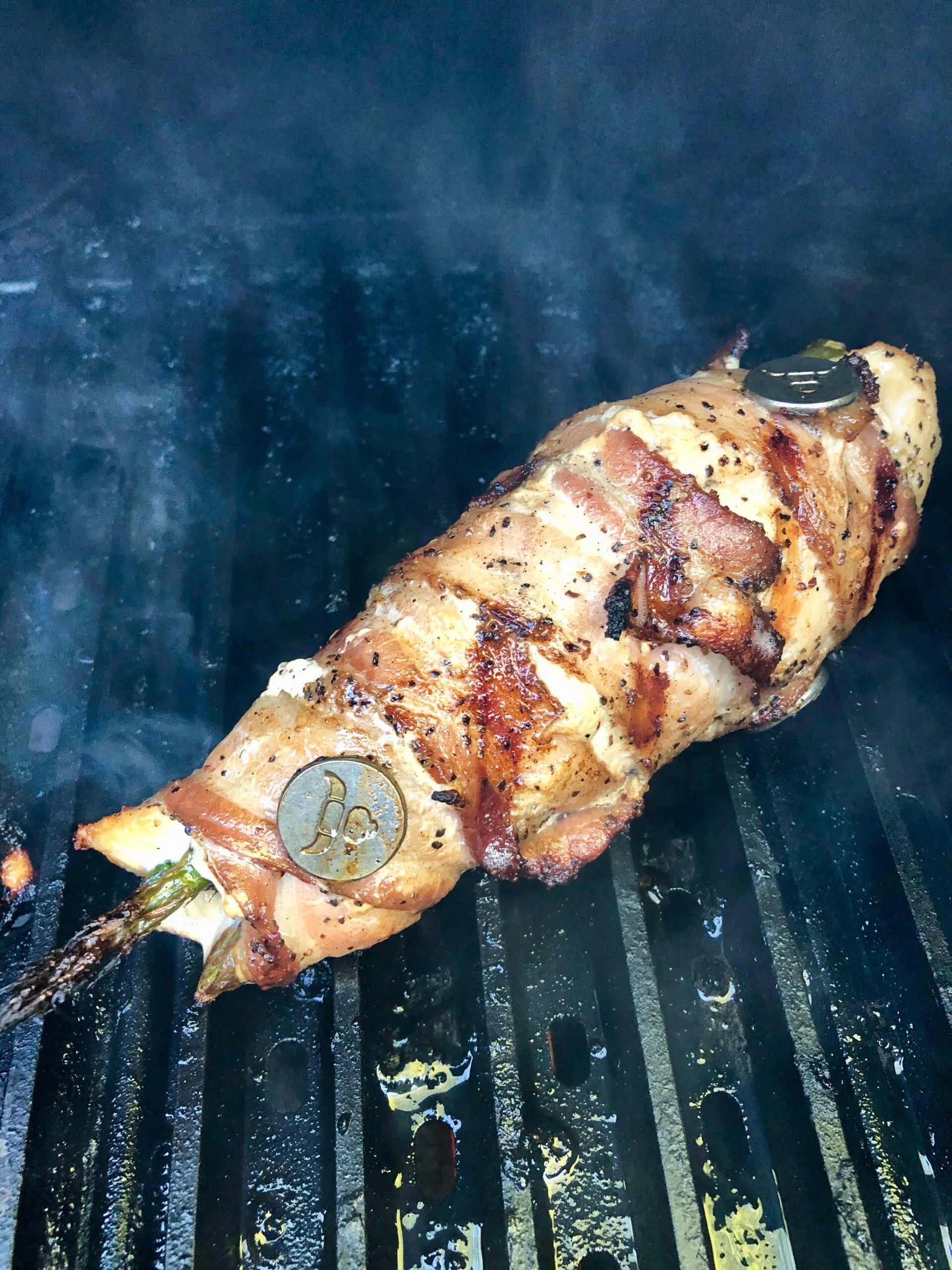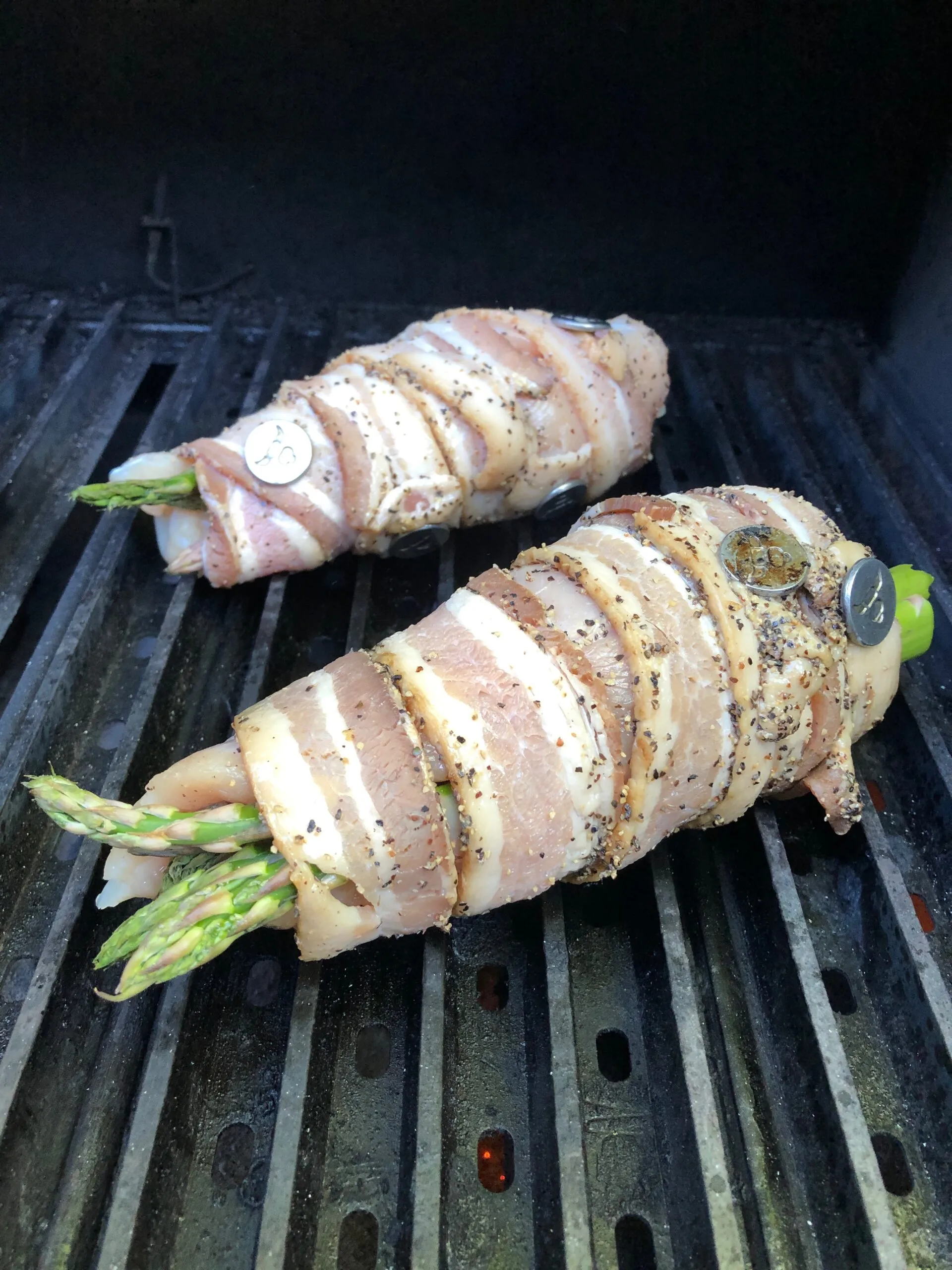 Susan loves the PINZ for bacon wrapped everything. The second version was stuffed with 3-4 spears of asparagus and some hard cheese. Stuffed, bacon wrapped chicken breast is a great recipe to take and make your own. Chicken is a really great lean, versatile protein that you can do a lot with, especially on the grill.